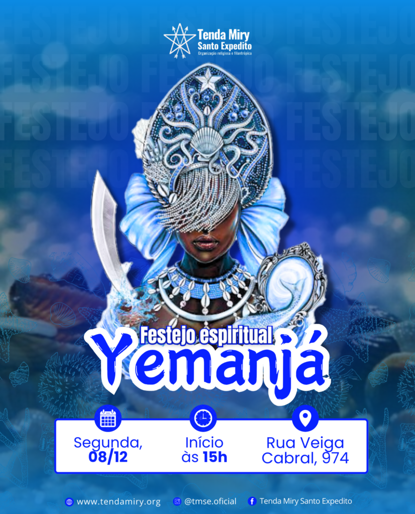 A Tenda Miry Santo Expedito homenageia o último orixá em 2025. Dia 08 de dezembro, é festejado o dia da Senhora da Conceição, e em festa o povo das águas, na matriz africana, a rainha do Mar, Mãe Yemanjá. A orixá é a comandante da segunda linha, e na tradição da umbanda nessa Casa, comanda a linha de cura. O dia também é de apresentação pública de novos médiuns, que vão receber os cajados, para exercerem missão espiritual com seus guias, praticar a caridade como membros voluntários da TMSE.